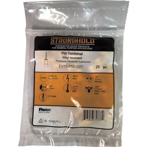 ストロングホールド ビニール絶縁被覆付ピン圧着端子 電線サイズ:AWG12~10/3.5~5.5sq ピンサイズ:2.5mm 25個入り EV10-P55-QYY EV10-P55-QYY