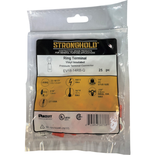 ストロングホールド ビニール絶縁被覆付圧着端子(丸形) 電線サイズ:AWG22~18/0.3~0.75sq 取付ネジ:M6 25個入り EV18-14RB-Q EV18-14RB-Q