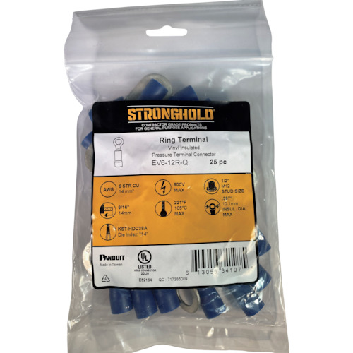 ストロングホールド ビニール絶縁被覆付圧着端子(丸形) 電線サイズ:AWG6/14sq 取付ネジ:M12 25個入り EV6-12R-Q EV6-12R-Q
