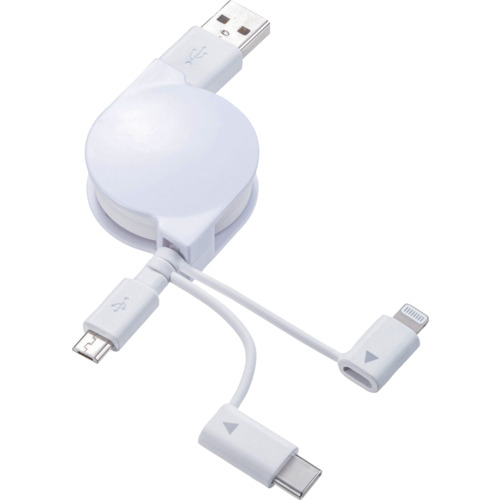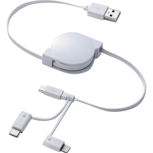 ●3in1 充電ケーブル ライトニング マイクロUSB USB Type-C巻取りケーブル(Lightning・micro USB・Type-C対応・MFi認証品・通信・3Way・ホワイト)
