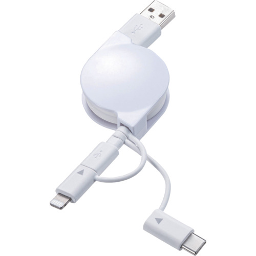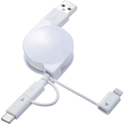 ●2つの変換アダプタ付で、ライトニングケーブル、USB2.0Type-Cケーブル、microUSBケーブルとして使用できる、巻取り式USBケーブルです。