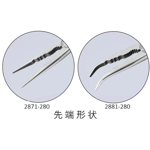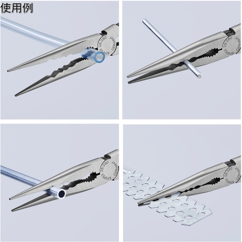 ●0821-145:全長145mm、切断能力(中硬線3.0mm、硬線2.0mm)●7401-180:全長180mm、切断能力(中硬線3.8mm、硬線2.7mm、ピアノ線2.2mm)●2871-280:全長280mm、先端3.0×2.5mm●2881-280:全長280mm、先端2.5×2.5mm、先端角45°