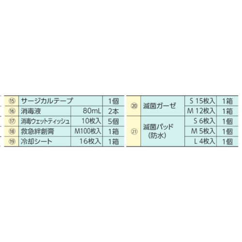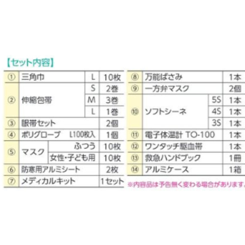 ●三角巾×10枚、伸縮包帯(S×2個、M×3個、L×1個)、眼帯セット×2個、ポリグローブL100枚●マスク(ふつう10枚女性、子ども10枚)、万能ばさみ、防寒用アルミシート×2枚、メディカルキット、一方弁マスク×2個、●ソフトシーネ(5S、4S、3S)、電子体温計、ワンタッチ駆血帯、救急ハンドブック、アルミケース、サージカルテープ●消毒液80ml×2本、消毒ウェットティッシュ10枚×5個、救急絆創膏M100枚●冷却シート×16枚、滅菌ガーゼ(S:15枚入、M:12枚入)×1箱、滅菌パッド(S:6枚入、M:5枚入、L:4枚入)