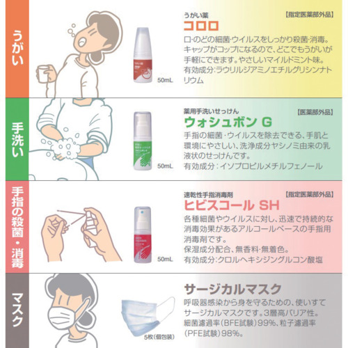 ●ウォシュボンS 50ml(医薬部外品) 1本●ヒビスコールSH 50ml(指定医薬部外品) 1本●コロロ 50ml(指定医薬部外品) 1本●サージカルマスク 5枚●衛生対策マニュアルカード(和文・英文) 1枚