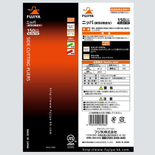 フジ矢 ニッパ(斜刃2枚合わせ) 150mm 50A-150