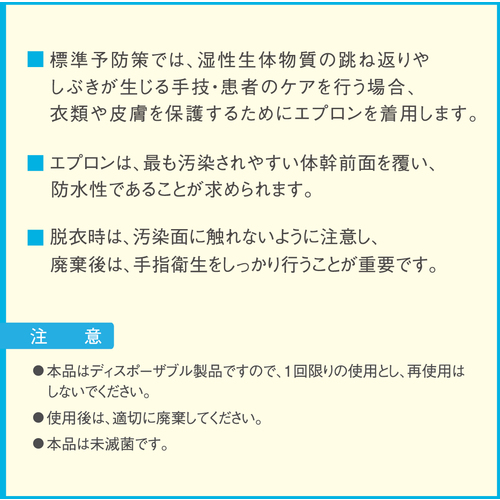 ●防水性の高いポリエチレン製で、水、血液、体液などの湿性生体物質を通さず、感染防御にも優れています。