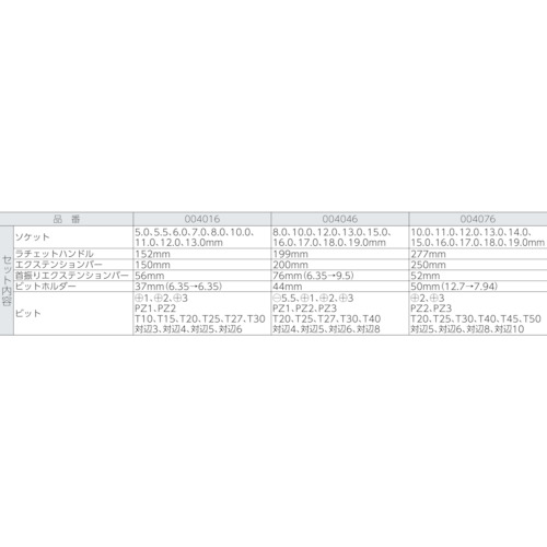 ●ソケット(8、10、11、12、13、15、16、17、18、19)●アダプター(44mm)●エクステンションバー(76mm)●エクステンションバー(200mm)●ビット+1、+2、+3、PZ1、PZ2、PZ3、T20、T25、T27、T30、T40、対辺4、対辺5、対辺6、対辺8