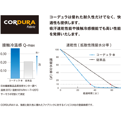●当社従来品と比較し、速乾スピードは約2倍、冷感機能は約1.5倍になりました。