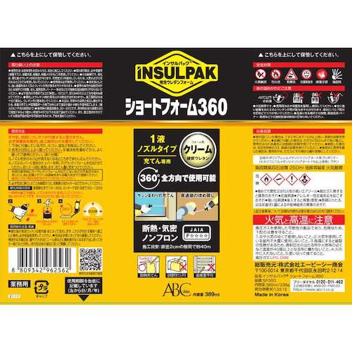 ABC 簡易型発泡ウレタンフォーム 1液ノズルタイプ インサルパック ショートフォーム360 フォーム色:クリーム SF360