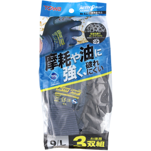 9. トワロン まとめ買い ニトリル背抜き手袋 アクティブグリップアドバンス 9/L (3双入) 533-9L