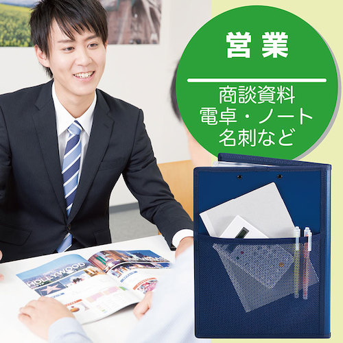 ●メッシュポケットやペンホルダーに加え、クリアーホルダーも入る「オープンポケット」(1枚)、A4書類が入る「クリアーポケット」(5枚)、小物を入れられる「チャック付きポケット」(1枚)、名刺が約15枚収納できる「名刺ポケット」(1枚)がつき、収納力が充実しています。
