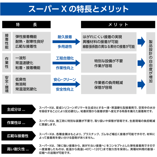 ●硬化皮膜が強靭性と柔軟性を併せ持つ「弾性接着剤」ですので、被着材の膨張・収縮による動きに追従するほか、低温(-60℃)から高温(120℃)までの温度変化への対応や各種耐薬品性に優れています。