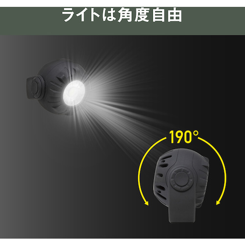 ●ライト部が上下190度回転し、赤色点滅機能付で用途の幅が広がります。