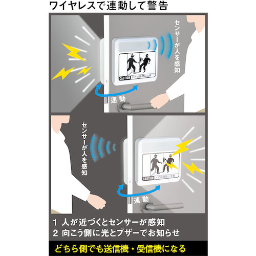 ●人が近づくとセンサーが感知し、向こう側に光と音でお知らせします。
