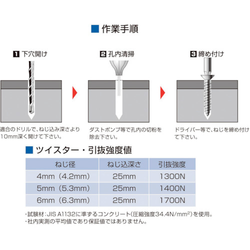 ●※引抜強度試験は試験材:JIS A1132に準ずるコンクリート圧縮強度34.4N/mm(の2乗)にビスを25mm埋め込み実施。