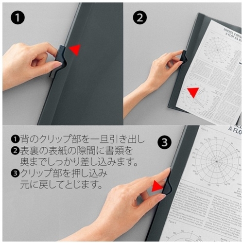 ●本体背のクリップ部をスライドさせて引き出し、書類を奥までしっかり差し込んでとじます。