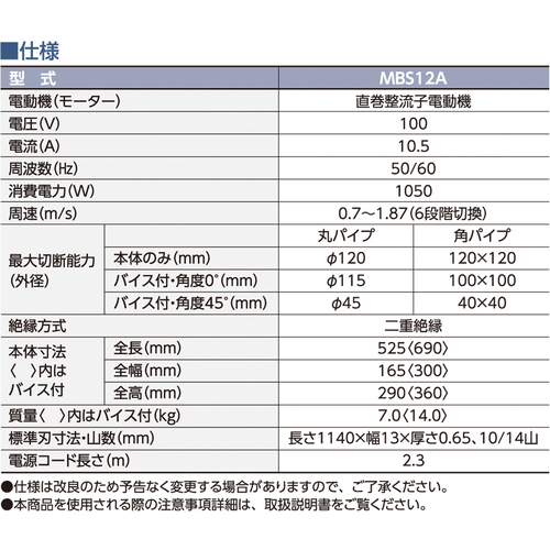 ●切断能力:丸パイプ115mm(バイスから外して使用の場合120mm)