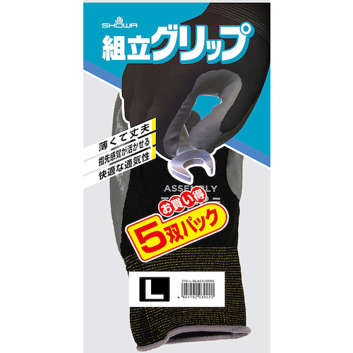 SHOWA ニトリルゴム背抜き手袋 組立グリップ5双パック ブラック Lサイズ NO370-L5PBK