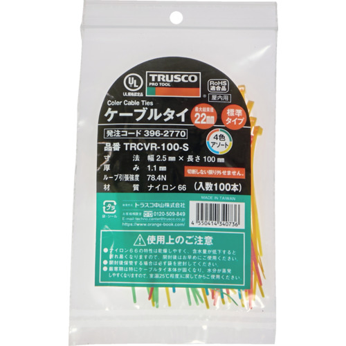 TRUSCO カラーケーブルタイ 幅8.0mmX長さ450mm最大結束φ128標準型 アソート TRCVR-450-S