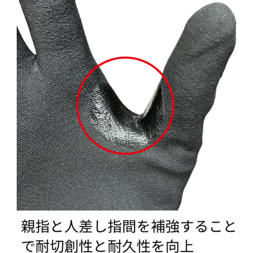 ●親指と人差し指間の指又を補強することで耐切創性と耐久性を向上させました。
