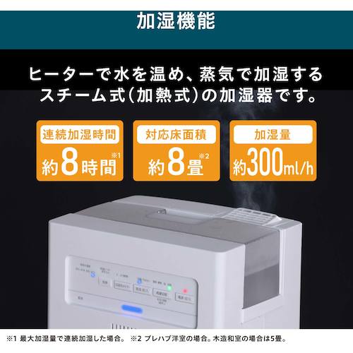 ●適用床面積:空気清浄機能/17畳、加湿機能/8畳(プレハブ)・5畳(木造)