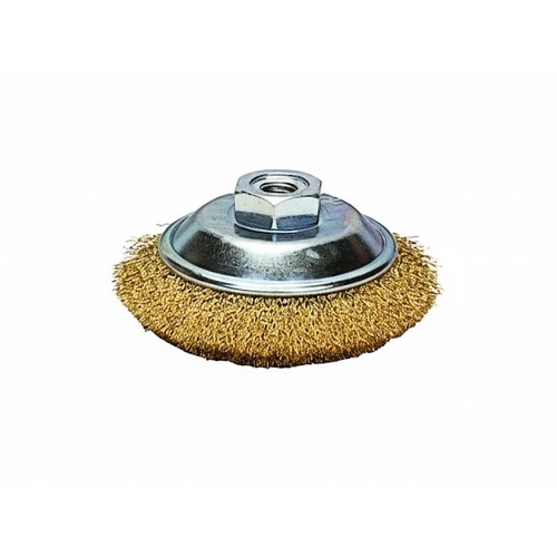 ●ベベルブラシ 真鍮ベベルブラシ(BS) Φ85 真鍮 線径0.15 【電動工具用ベベルブラシ】 ベベル型 ワイヤーブラシ M10xP1.5 の製品になります。