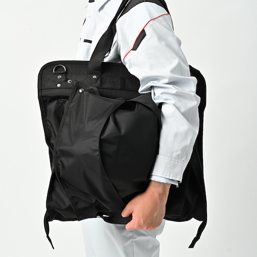 ●ガーメントバッグから着想を得て、左右のカバーを留めたら半分に畳んでコンパクトなバッグになります。