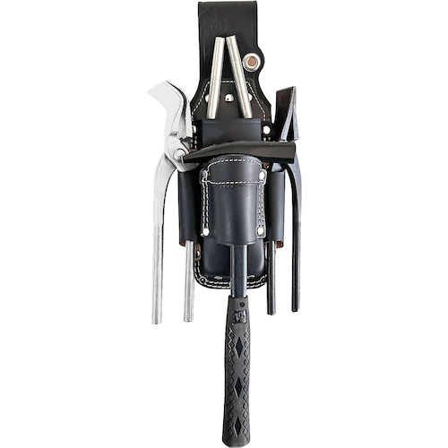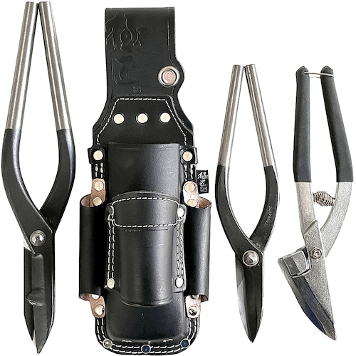 ●大型サイズの板金鋏の他、直線切鋏の収納にも対応したサイズで設計され、太陽光による変色や老化を防ぐ黒革素材を採用したツールケースです。