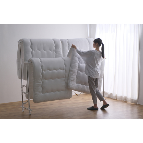 ●片側のサイドバーが低い位置にあり、ふとんを横からスライドさせて干すことができるので、高く持ち上げずにかけられます。