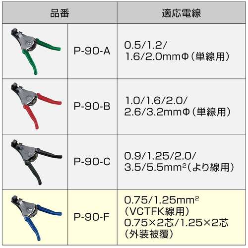 ●F-90-Fは、0.75/1.25mm2(VCTFK線用)、0.75×2芯/1.25×2芯(外装被覆)に対応。