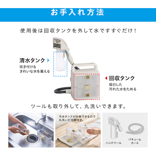 ●スプレーで水を吹きかけ汚れを浮かせ、浮かせた汚れを水と共に回収できるリンサークリーナーです。