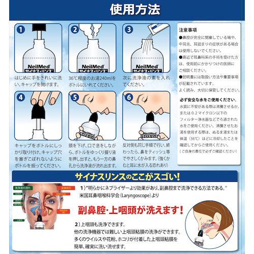 ●専用の洗浄ボトルは240mlの大容量の水流で鼻うがいができます。鼻腔の奥まで洗浄するには片鼻100ml以上必要と言われるので、サイナスリンスはたっぷり洗うことができます。
