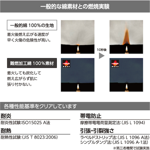 ●難燃加工綿100%で作られた耐炎・耐熱・制電性に優れた素材です。