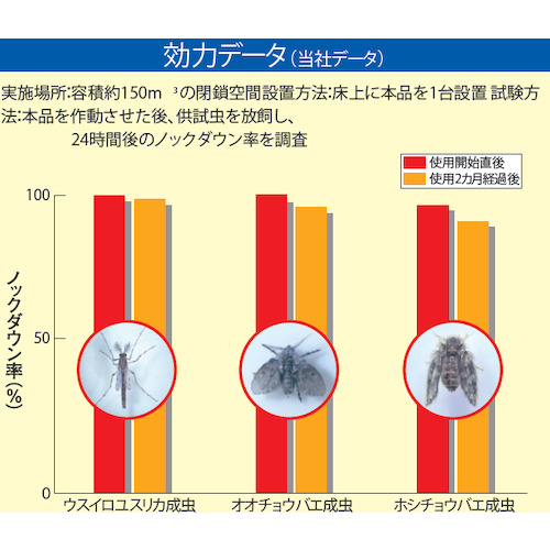 ●AC電源で拡散性効果の安定性に優れ、24時間連続使用で約60日間(約1500時間)の防除及び殺虫が可能です。