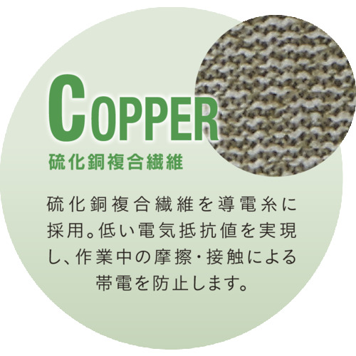 ●硫化銅複合繊維を採用し、摩擦や接触による帯電を防ぎます。