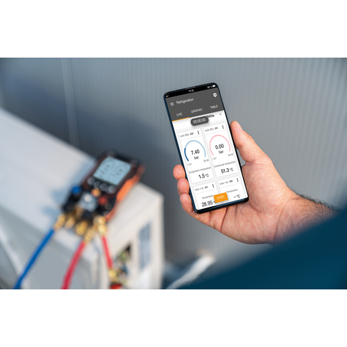 ●4バルブ式デジタルマニホールドtesto557sは、バックライト付き大型ディスプレイ、防塵防水の堅牢ボディ、高度な測定メニューと演算機能を搭載しています。