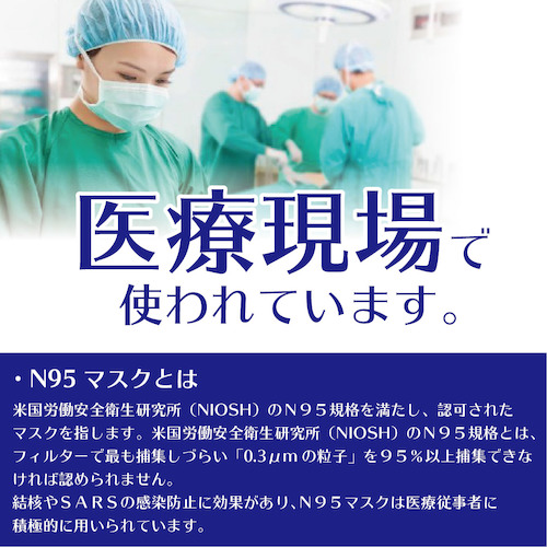 ●米国NIOSH規格による塩化ナトリウム微粒子に対し、95%以上の捕集効果を持っています(N-95対応)