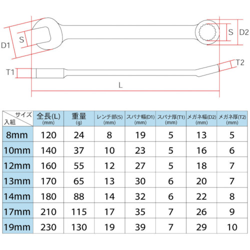 ●オープンエンドとメガネのコンビレンチで、サイズの異なる7本組みのセットです。