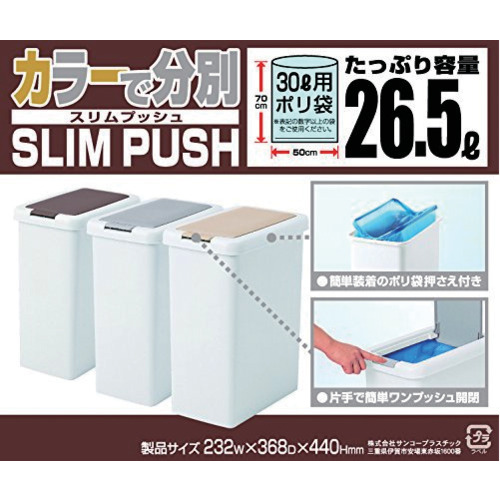 SANKO pla 030276 フタ付きゴミ箱 スリムプッシュ 26.5L LBE Lベージュ 232×368×440   30276