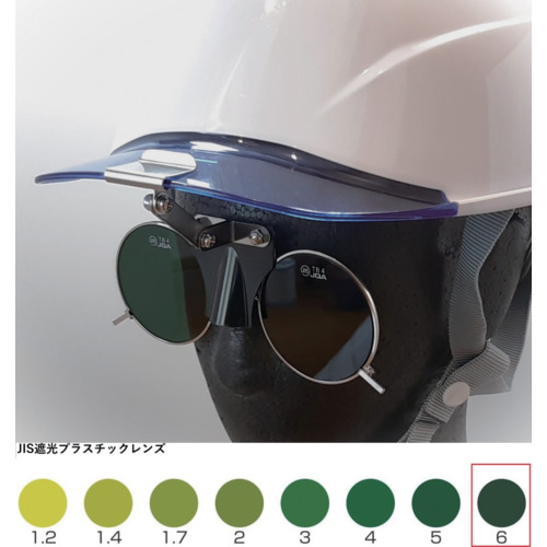 ●ヘルメットひさしに差し込むだけで使える炉前作業、仮付けなどに最適なフロント形遮光めがね