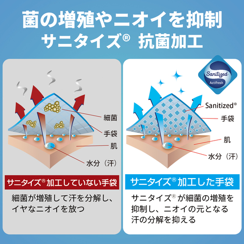 ●菌の繁殖を抑制し、汗などによるニオイを防ぐサニタイズ抗菌抑臭加工を施しています。