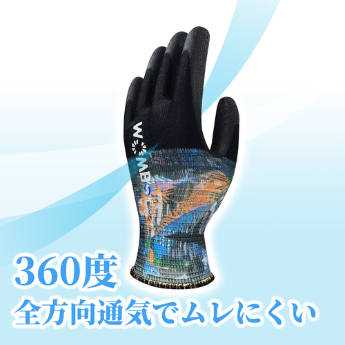 ●背抜きの甲側だけでなく手のひらのコーティング部にも通気性があり、360度全方向通気でムレを軽減します。