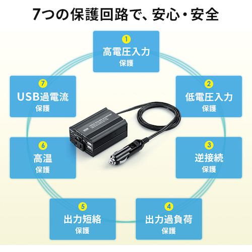 ●車のアクセサリソケットに家庭用コンセントとUSB電源ポートを設置できるカーインバーターです。