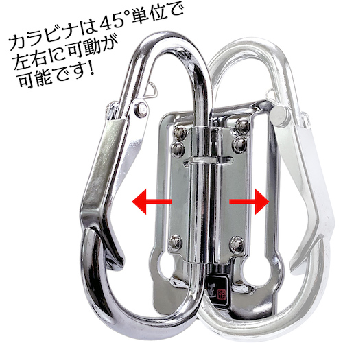 ●フックのツメが中に湾曲しているため、工具の出し入れがスムーズで、カラビナは作業空間に合わせた三段階の可動式です。