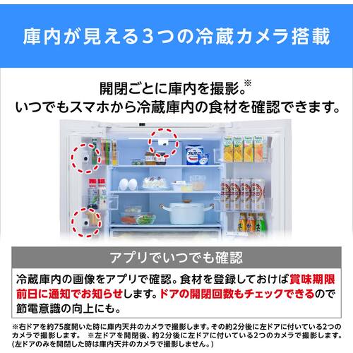 ●「3つの冷蔵庫カメラ」搭載で、スマホにアプリをインストールすると、お買い物中でも冷蔵室内を表示できるので、食材の買い忘れや買いすぎ防止に、とても便利です。また、過去14日分の冷蔵室ドアの開閉回数を表示します。