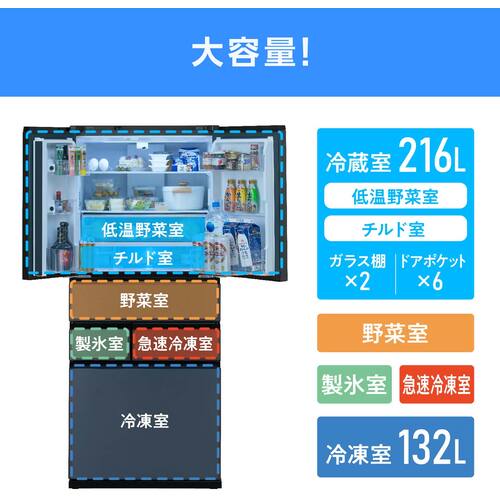 ●定格内容積:【全体】453L【冷蔵室】(チルド室)216L(9L)【野菜室】66L【冷凍室】132L【急速冷凍室】24L【製氷室】15L