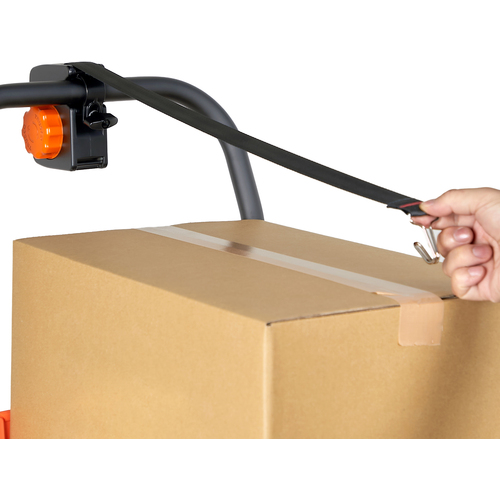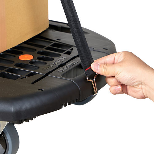 ●樹脂台車のハンドルに取り付けてベルトを引出し、台車荷台のリブ部に引掛けて使用します。