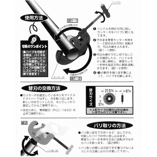 ●切断時ハンドルを強く締めすぎると刃の損傷やパイプの変形原因になります。