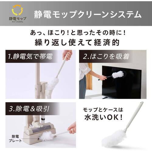 ●独自技術「静電モップクリーンシステム搭載」し、静電気でをほこりを吸着、クリーナーで吸引するから何度も使えます。