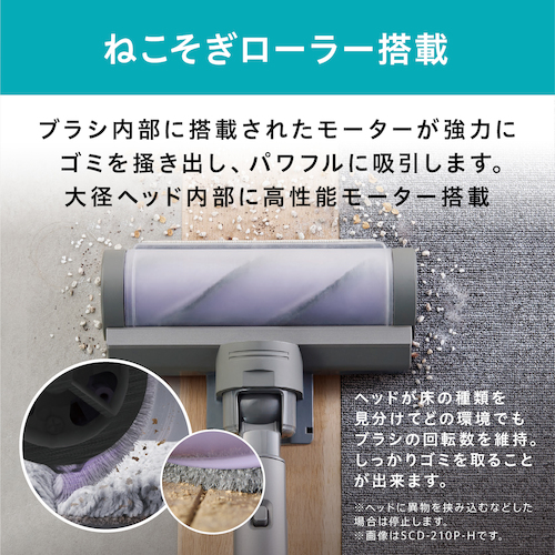 ●「ねこそぎローラー」搭載。ヘッドが床の種類を見分けてどの環境でもブラシの回転数を維持。しっかりゴミを取ることができます(※ヘッドに異物を挟み込むなどした場合は停止します)。